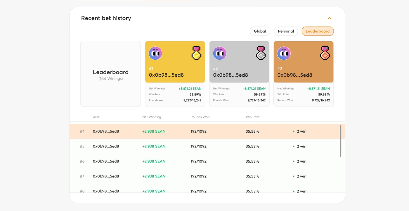 Furthermore, they can switch to the ‘Leaderboard’ tab to see the top 50 players ranked by their net winnings and their stats ;) (Maybe one can identify a pattern of winning?)